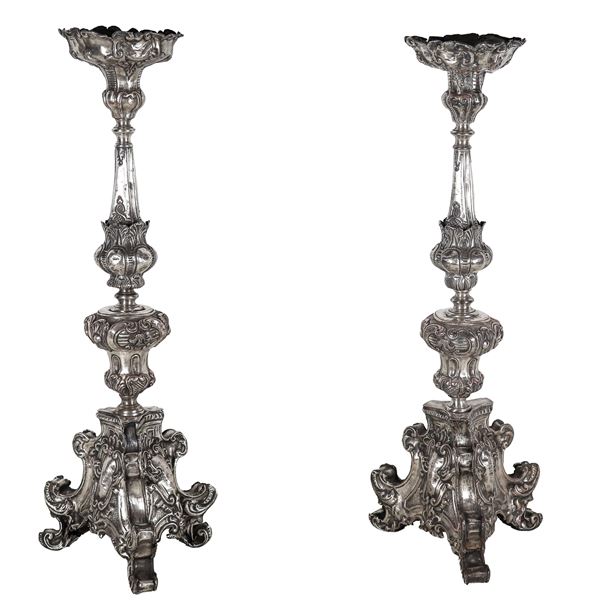 Pair of ancient Roman torch holders in silvered copper, chiseled and embossed with Louis XIV motifs