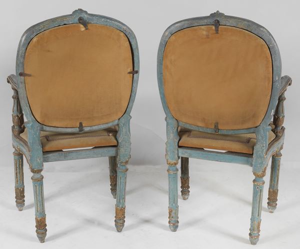 Pair of antique Louis XVI armchairs from the Marche, in lacquered and gilded wood with semi-oval backs and four fluted legs, cover in Havana [..]