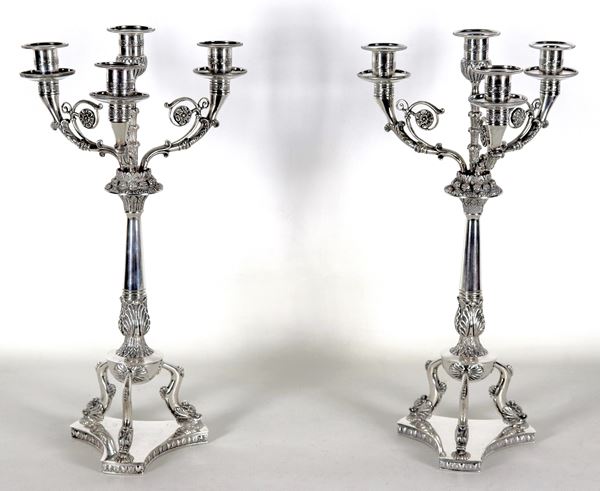 Pair of chiselled and embossed silver candlesticks with First Empire motifs, four flames each, gr. 2650