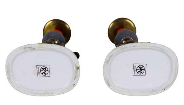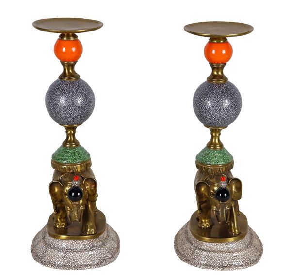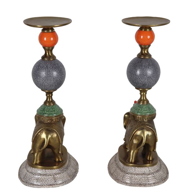 Pair of sculptures "Elephants with risers", in gilded bronze and enamels