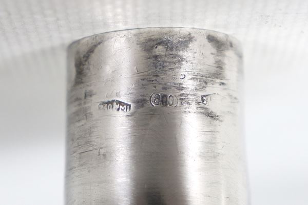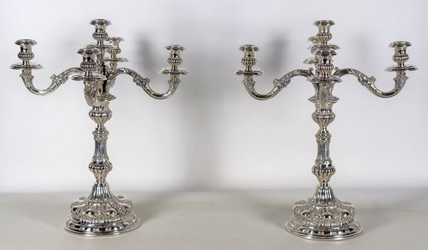 Pair of silver candlesticks, entirely chiseled and embossed with floral motifs, volutes and pods, 5 flames each. Stamps from the Fascist period, [..]