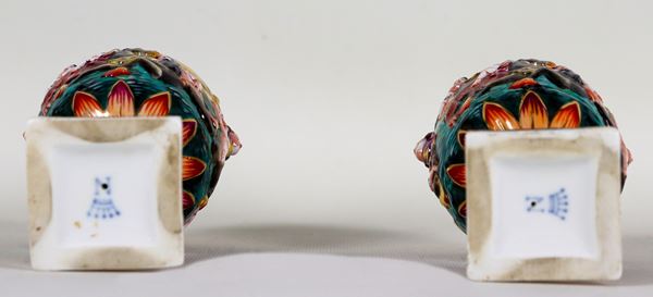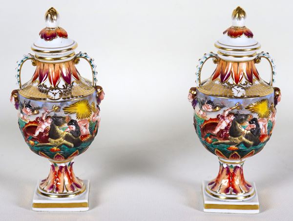 Pair of small amphorae in polychrome and painted Capodimonte porcelain, with mythological scenes in relief