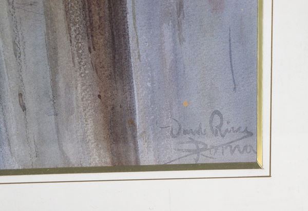Signed and inscribed Rome. "Glimpse of street with characters and front elevation of an ancient building", watercolor on paper