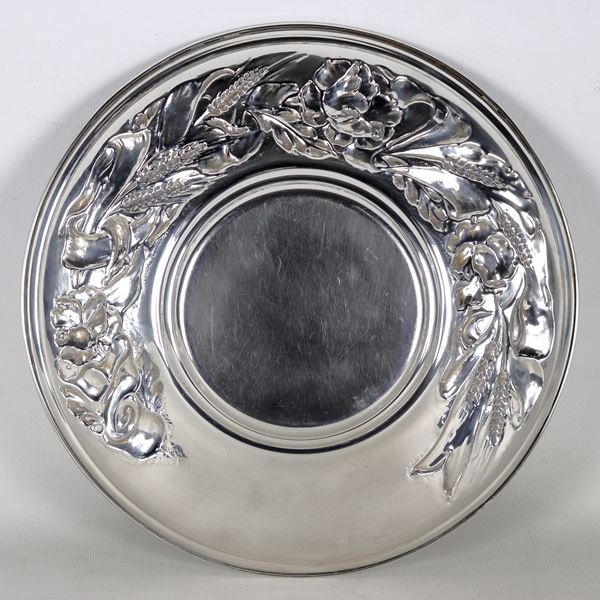 Round fruit bowl in 925 silver, with chiselled and embossed edge in relief with wheat ears motifs, gr. 430