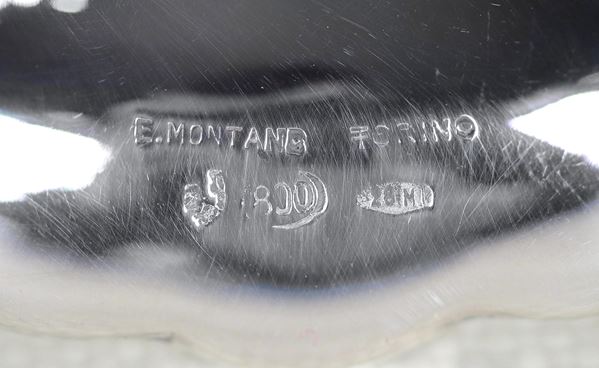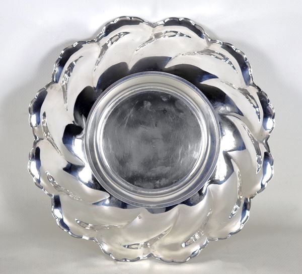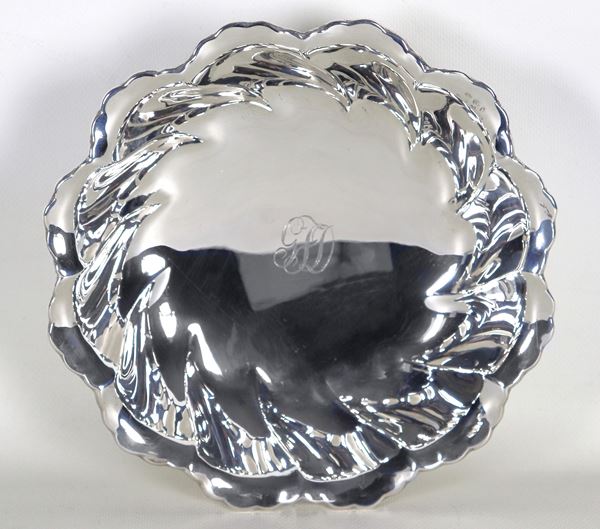 Round silver bowl with curved and embossed edge, engraved monogram on the bottom, gr. 295