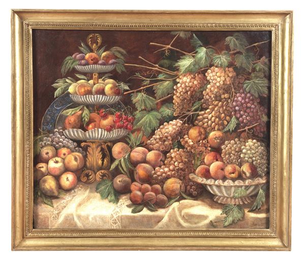 "Still life of fruit with vase and stand", fine oil painting on canvas