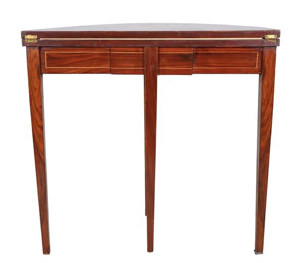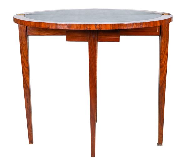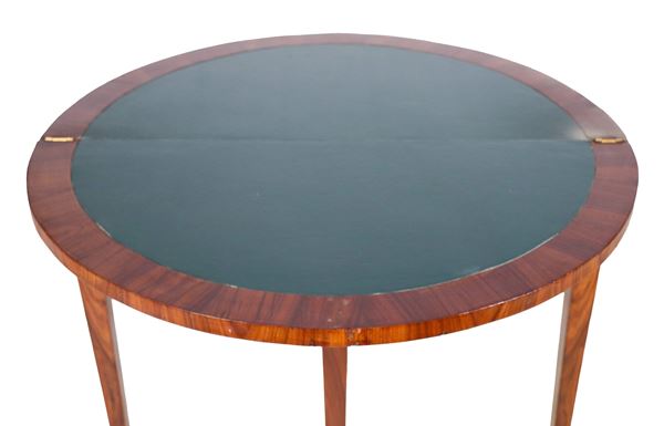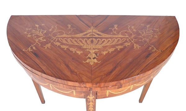 Semi-round game table in walnut and bois de rose, with inlays of floral scrolls, amphora and garlands. Folding top with green leather covering [..]