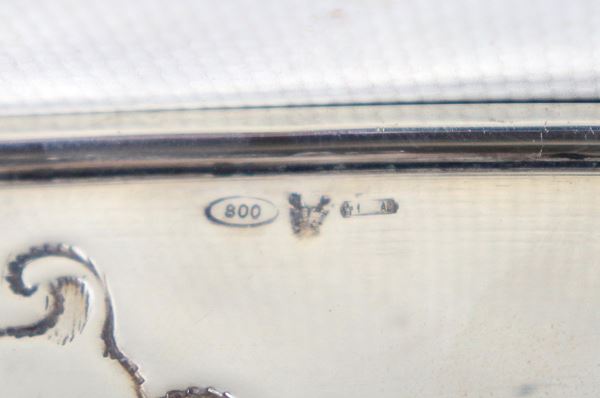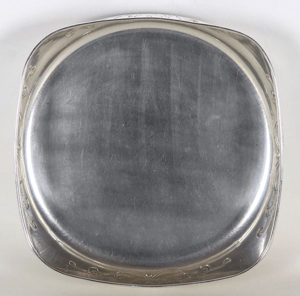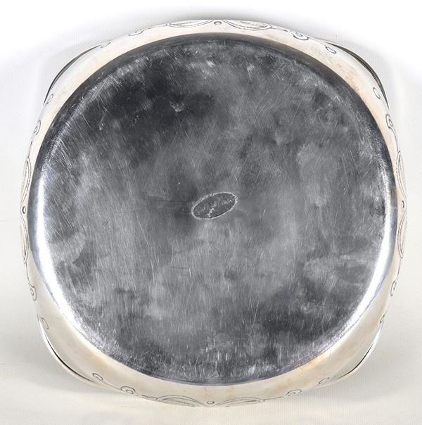 Silver fruit bowl with a shaped square shape, with an embossed and chiseled edge with floral scrolls, gr. 385
