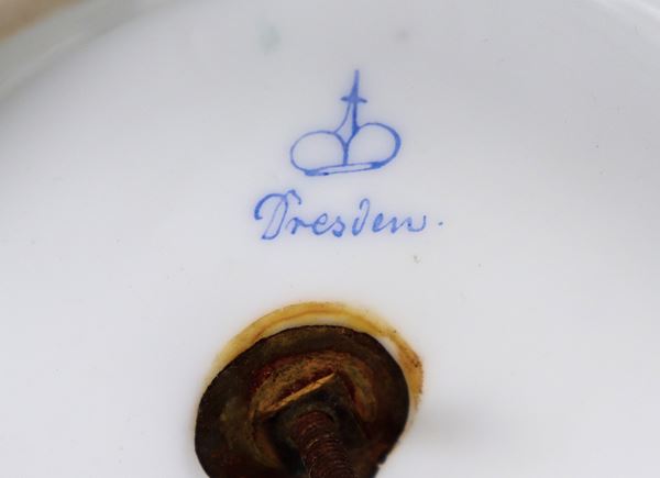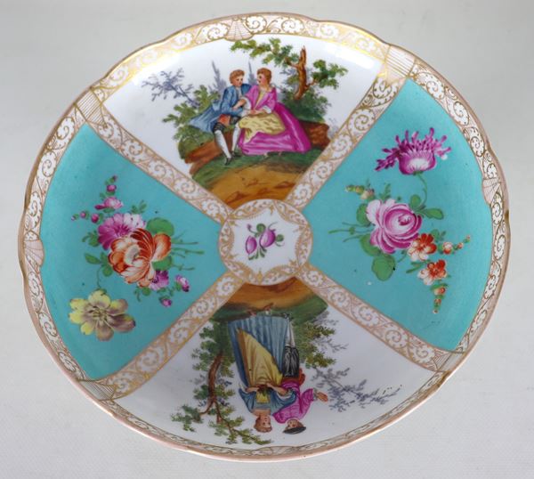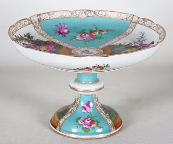Stand in German polychrome porcelain from Dresden with polychrome decorations of flowers and gallant scenes