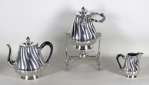 Tea and coffee service in silvered metal, embossed and chiselled, with ebonized wooden handles, marked Finzi-Firenze (3 pcs)