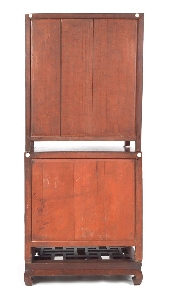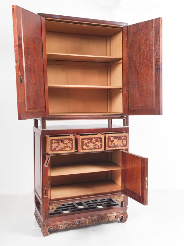 Ancient Chinese cabinet with two bodies in decorated wood, lacquered and painted with oriental animal and flower motifs. The upper part has [..]