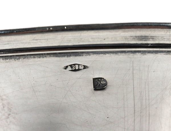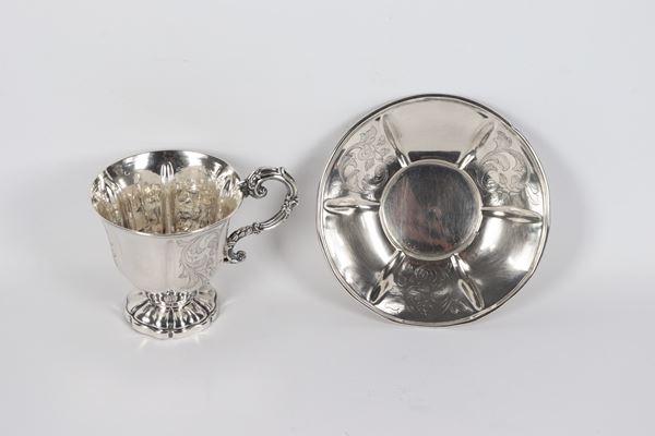 Ancient Roman silver cup with saucer, chiseled and embossed with floral scrolls with curved handle. Papal State stamps and chamber stamps of [..]