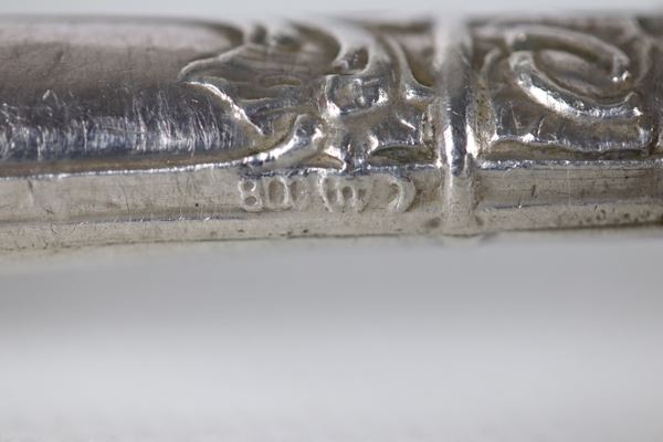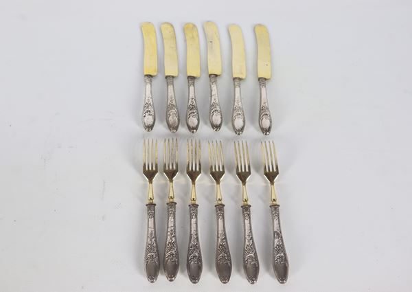 Antique dessert cutlery set with chiseled and embossed silver handles (12 pcs)