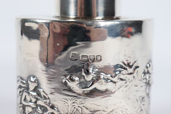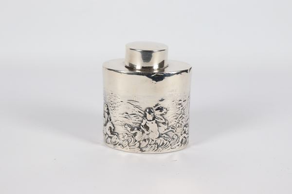 Antique Edward VII silver tea box, oval shape, chiseled and embossed with mythological scenes, dents, 200g