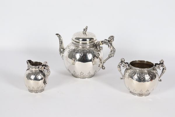 Antique English silver coffee service, Queen Victoria period, chiseled and embossed with colonial period motifs with caryatid-shaped handles [..]