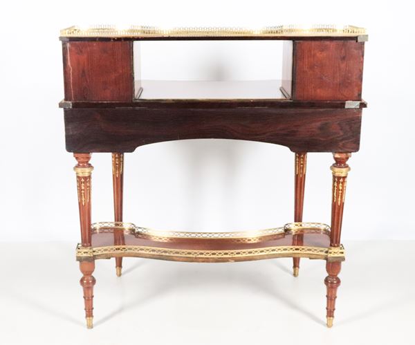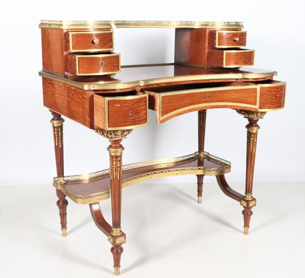 Antique French bonheur du jour of Louis XVI line in mahogany, with gilded bronze fittings and friezes, embossed and chiselled, on the raised [..]