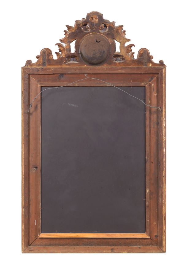 Antique French mirror in gilded and carved wood, with a frieze formed by curls and acanthus leaves, in the centre a clock with a white enamel [..]