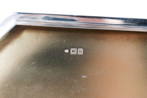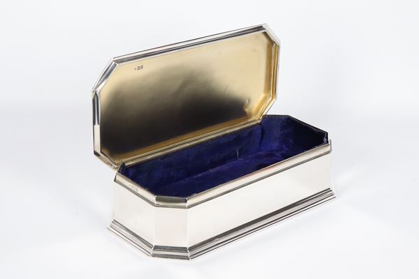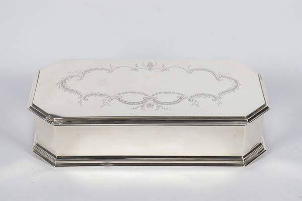 Antique large English silver box from the Edward VII era, octagonal in shape, with chased floral scrolls on the lid, 840 g