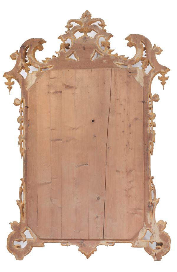 Antique mirror in gilded wood and carved with Louis XV motifs of acanthus leaves, curls and flowers, in the centre of the top a small bust of [..]