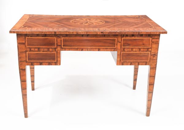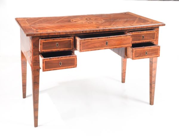 Antique Neapolitan Louis XVI center desk, in walnut, olive root and boxwood, with top inlaid with a central rosette motif and fillets, five [..]