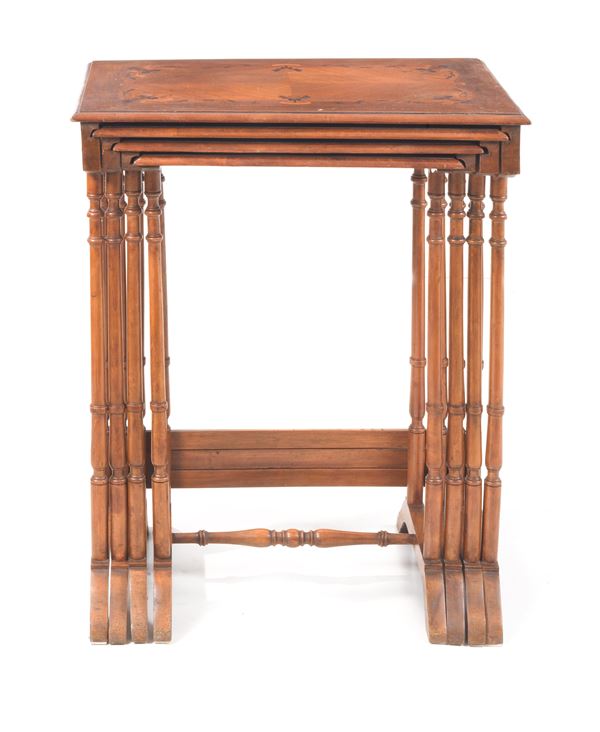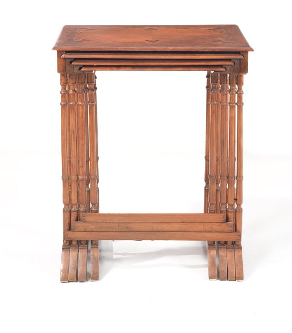 Antique nest of four tables in rosewood and blond mahogany, with tops inlaid with floral interlacing motifs