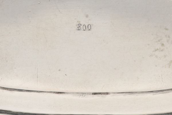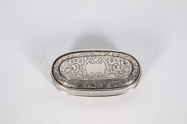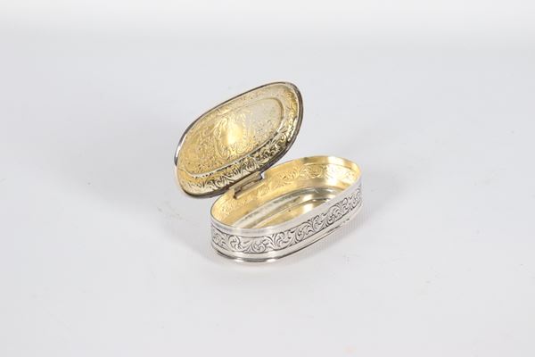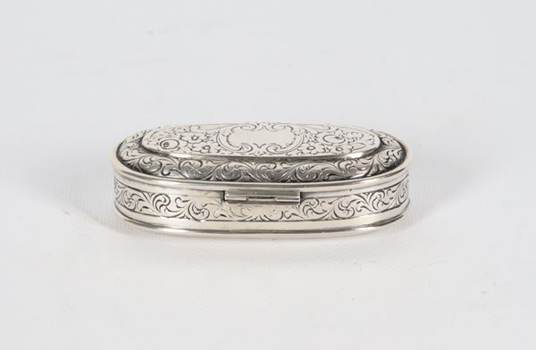 Antique oval silver snuffbox, chiseled and embossed with floral scroll and garland motifs, vermeil interior. Italian manufacture, 110g