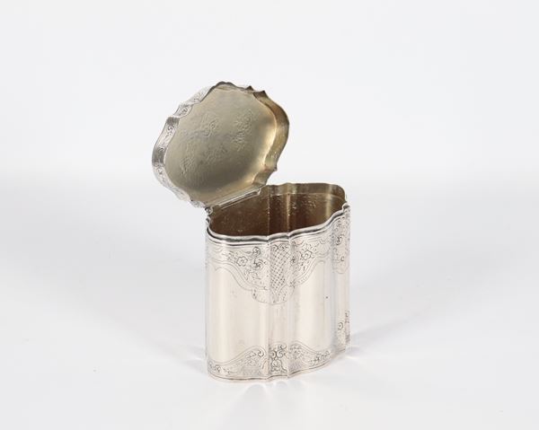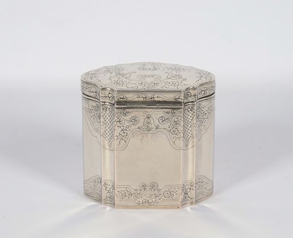Antique silver tea box, oval shaped and faceted, chiseled and embossed with floral scrolls, 274 g