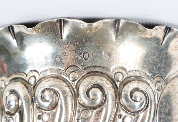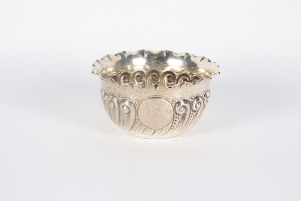 Antique small English silver cup, Queen Victoria period, chased and embossed with a jagged edge. London 1893 hallmarks, 140 gr.