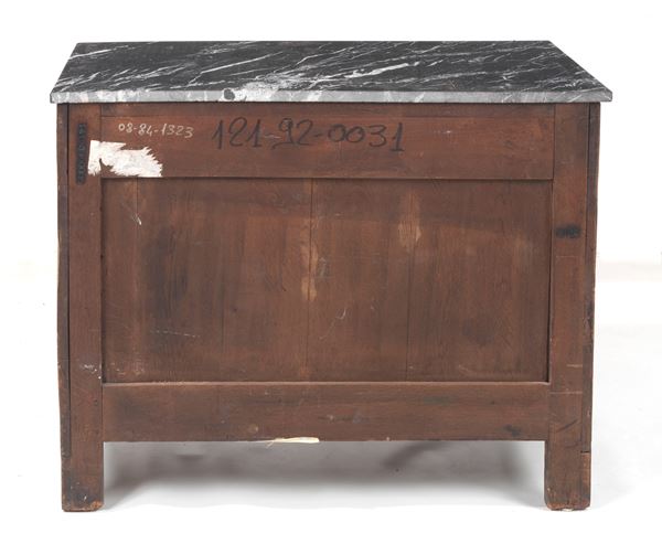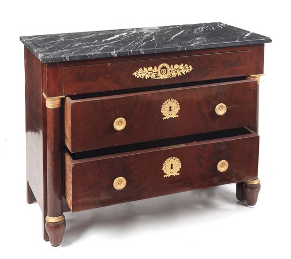 Antique small French chest of drawers from the Empire period in mahogany and mahogany feather, with friezes and fittings in gilded bronze, embossed [..]
