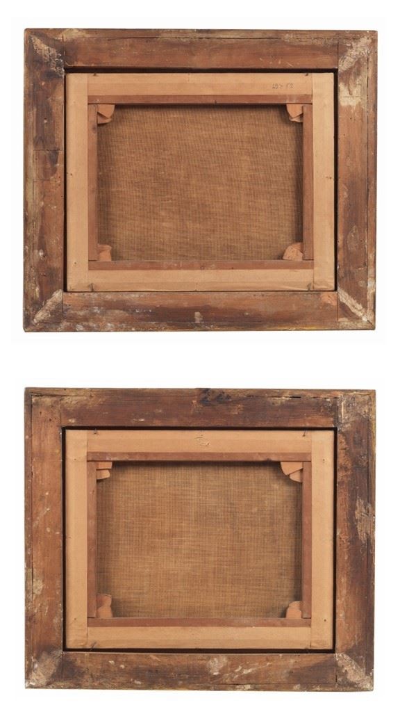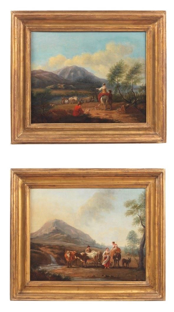 Att.ti. "Landscapes with wayfarers and peasants", pair of valuable oil paintings on canvas of excellent pictorial quality, gilded [..]