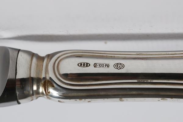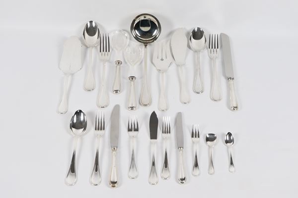 Consisting of 12 large spoons, 24 large forks, 12 large knives, 12 fruit forks, 12 fruit knives, 12 fish forks, 12 fish knives, 12 dessert forks, 12 ice cream spoons, 12 coffee spoons, 1 ladle, 2 serving spoons and forks, 1 cake server, 2 fish serving spoons, 1 bread knife and 2 salad serving spoons