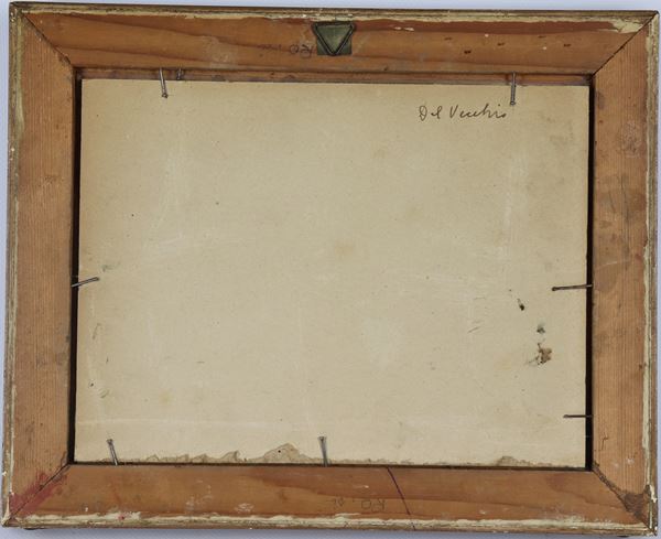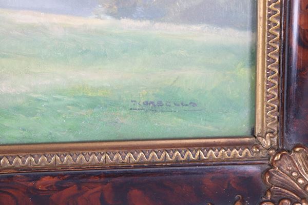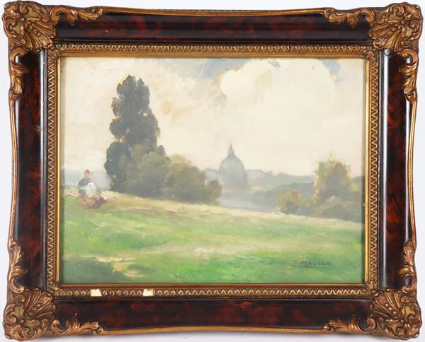 Signed. "Mother with little daughter on the lawn and in the background the dome of St. Peter's", small oil painting, frame decorated [..]