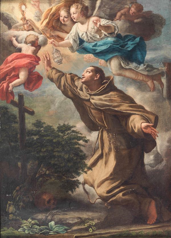 Workshop of "The Apparition of the Monstrance to Saint Pasquale Baylon", valuable oil painting on canvas of excellent pictorial quality [..]