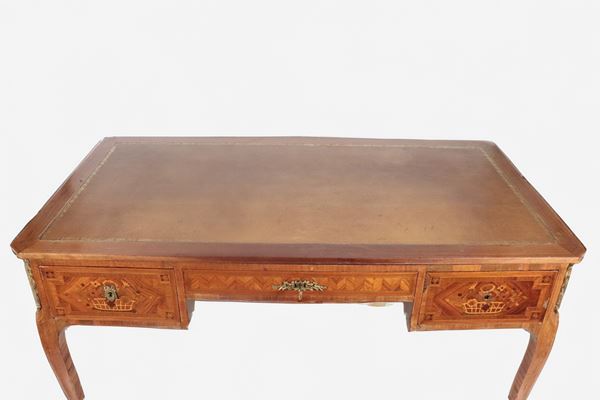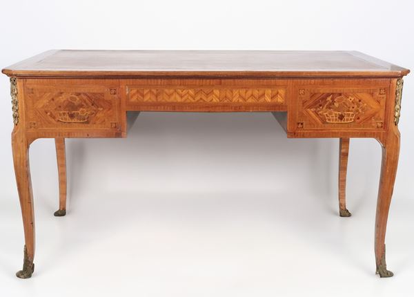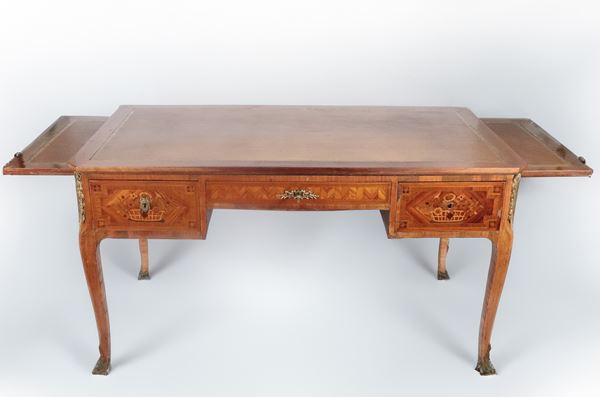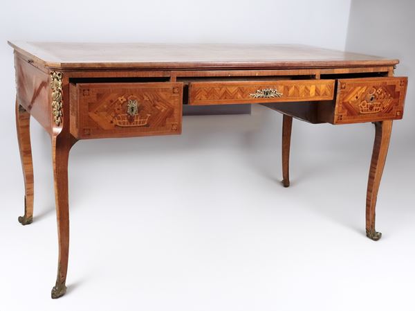 French rosewood and purple ebony center desk, with inlays of flower baskets and rosettes, friezes and fittings in gilded and chiselled bronze, [..]