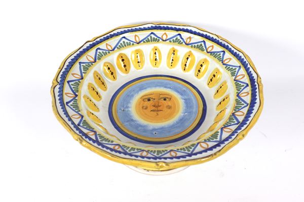 Fruit bowl in polychrome Italian majolica, with floral and geometric decorations, yellow borders. Slight defects