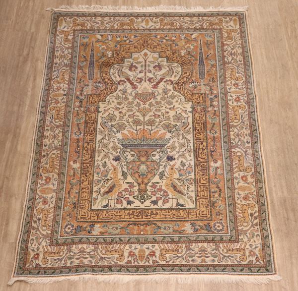 Ghiordes prayer rug, with floral designs on a brown background. Defects