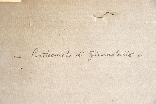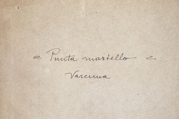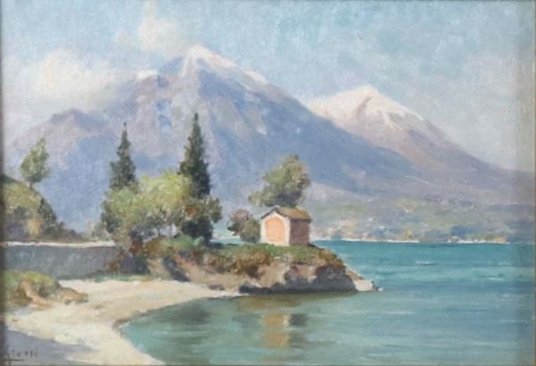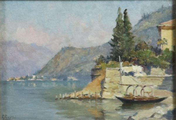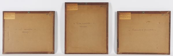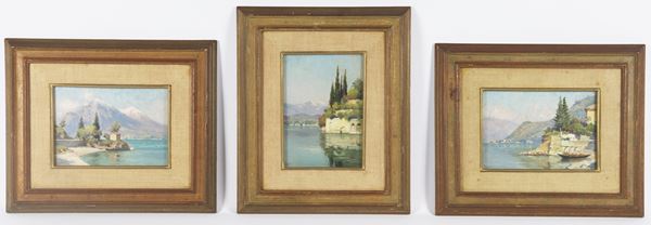 "Views of Morcatina and Punta Martello in Varenna" and "View of the small port of Fiumelatte", lot of three small oil paintings [..]