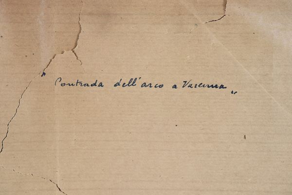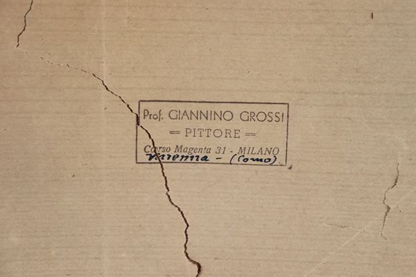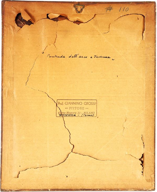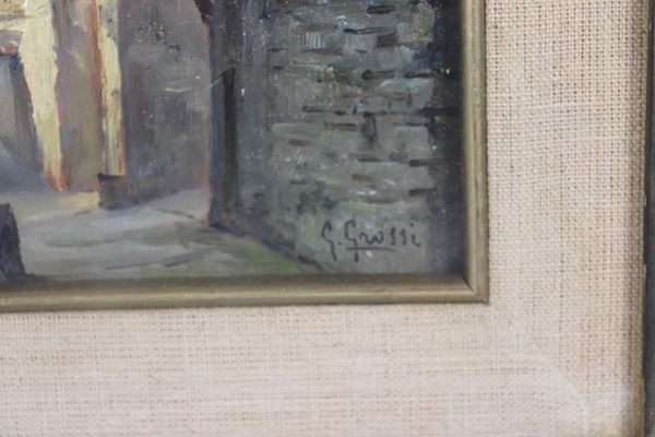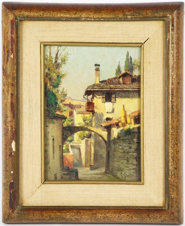 Signed. "Contrada dell'arco a Varenna", small oil painting on board, gilded frame and passepartout