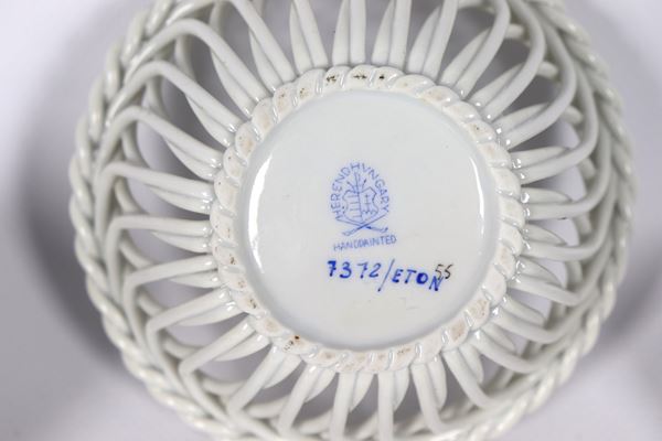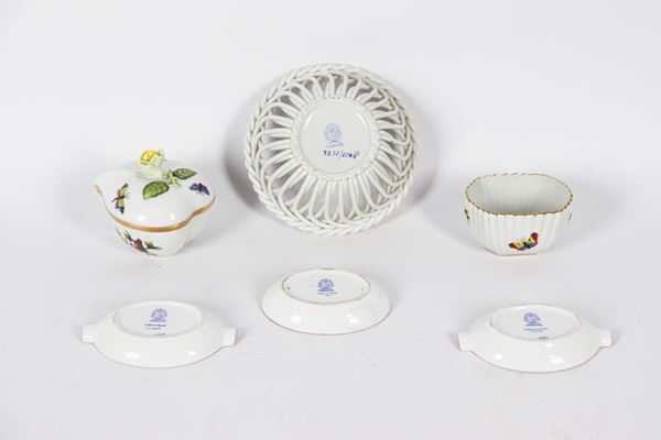 Herend polychrome porcelain lot of a basket, a sugar bowl, a cup and three oval saucers (6 pcs)