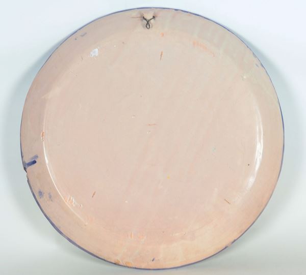 Large wall plate in Neapolitan majolica with green decorations, bunch of grapes in the center