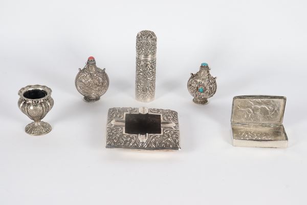 Lot in chiseled and embossed silver of: a cigar case, two perfume holders, a jar, a snuffbox and an ashtray (6 pcs), gr. 300