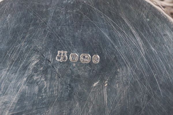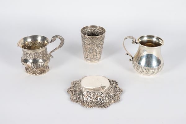 Lot in English and Oriental chiseled and embossed silver of: two small mugs, a glass and a small round centrepiece (4 pcs), gr. 420