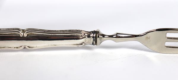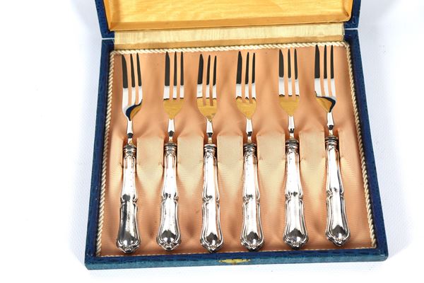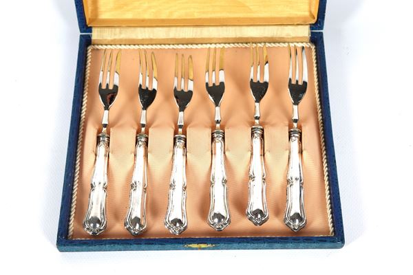 Lot of six dessert forks with handles in chiselled and embossed silver, with attached case
