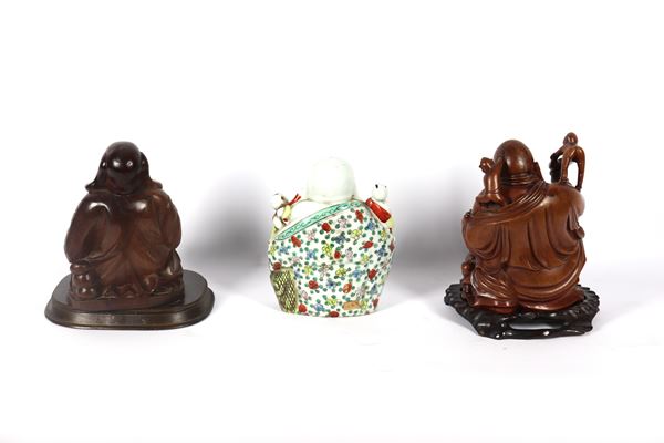 Lot of three Chinese Buddhas, one in polychrome porcelain and two in wood