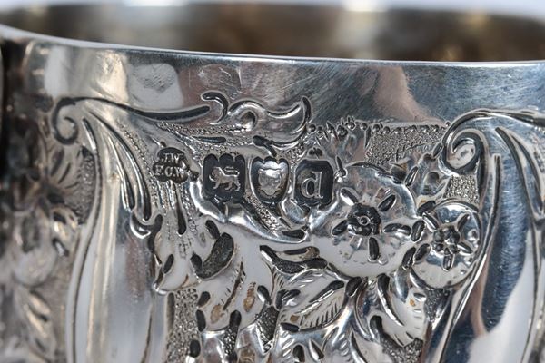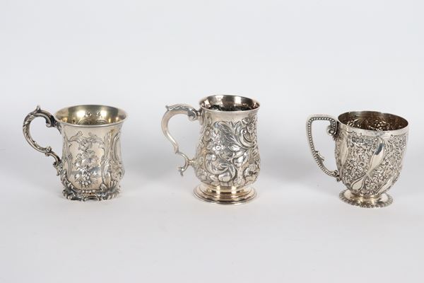 Lot of three small antique silver jugs, chiselled and embossed with floral and fruit scroll motifs, different shapes and sizes, 495 gr.