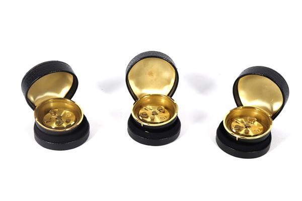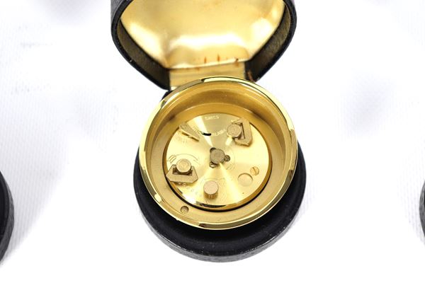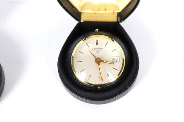 Lot of three table alarm clocks with date, Looping brand with leather cases. Not working, to be overhauled