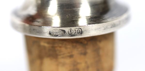 Lot of three wine bottle stoppers, covered in chiseled silver with pods