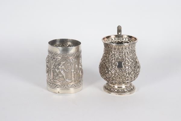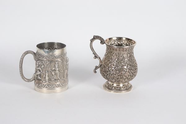 Lot of two small oriental silver jugs, Colonial Period, chiseled and embossed with floral motifs and figures of deities, gr. 350
