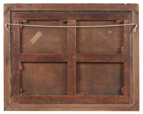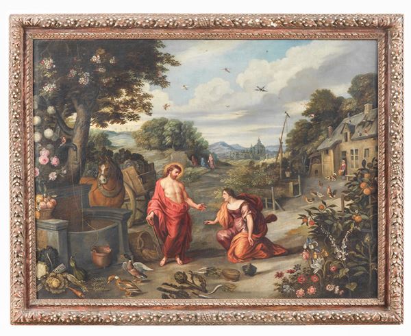 "Jesus and the Samaritan Woman", a valuable oil painting on canvas of excellent pictorial execution in a gilded and carved wooden [..]