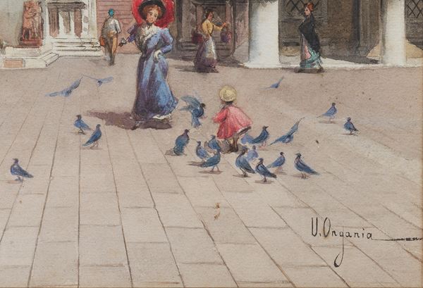 Signed. "View of Venice with Piazza San Marco", fine watercolor on paper in walnut frame and passepartout